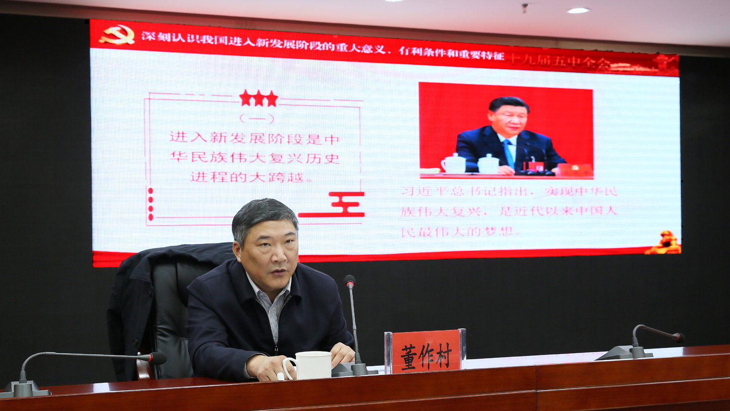 董作村緊緊圍繞黨的十九屆五中全會精神,從深刻認識我國進入新發展階段的重大意義、有利條件和重要特征,準確把握2035年遠景目標和“十四五”時期我國發展的指導方針、主要目標、重要任務,牢牢把握構建新發展格局的戰略構想和重要著力點,堅持黨的全面領導、動員各方面力量為實現“十四五”規劃和2035年遠景目標而團結奮斗等方面,作了系統闡釋和深入解讀。