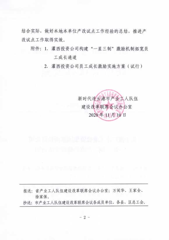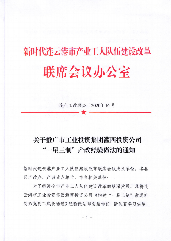 11月20日,新時代連云港市產(chǎn)業(yè)工人隊(duì)伍建設(shè)改革聯(lián)席會議辦公室在全市推廣工投集團(tuán)灌西投資公司“一星三制”產(chǎn)改經(jīng)驗(yàn)。