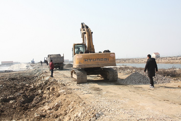 2月15日,在新河制鹽公司七至十班運(yùn)鹽路施工現(xiàn)場,我們看到南翼公司項(xiàng)目工程分公司的員工正在指揮兩臺小型工程車將石子傾倒在路基上,兩臺挖掘機(jī)正忙于將運(yùn)送來的石子整平。運(yùn)鹽河對面,三輛滿載土夾石的大型工程車一字排開,正等待卸載。據(jù)了解,目前正在施工的是新河制鹽分公司二期運(yùn)鹽路維修改造工程,該工程改造路段全長3300米,計劃總投資193萬元,其中路基鋪設(shè)部分由日曬制鹽公司出資45萬元,路面部分則由縣交通局承擔(dān),預(yù)計需要投入148萬元。該工程于去年底開始施工,預(yù)計三月中下旬全部鋪設(shè)完成。另外新河制鹽分公司一期一至十二班3300米運(yùn)鹽路改造工程計劃將于今年下半年實(shí)施。