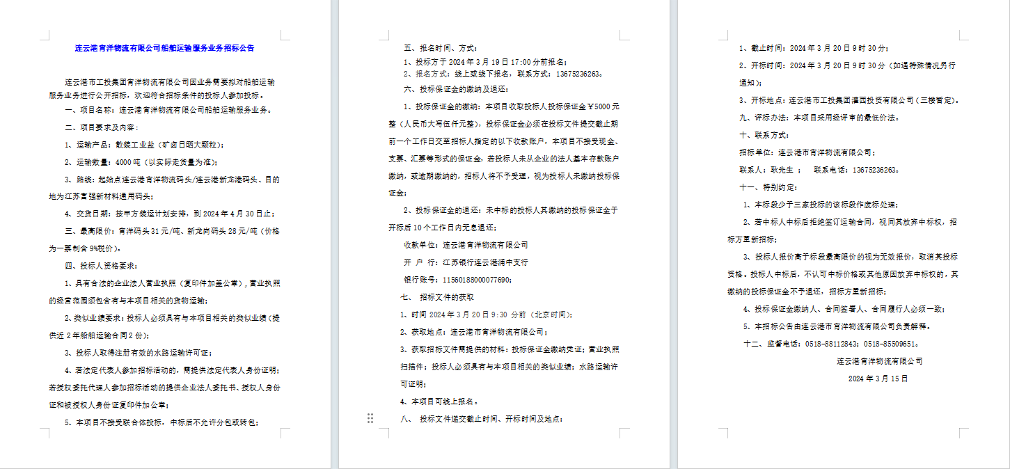 連云港宵洋物流有限公司船舶運輸服務業務招標公告