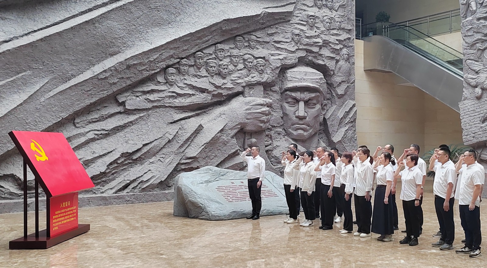 在連云港市革命博物館莊嚴肅穆的展廳內,大家認真聆聽講解員講述連云港地區的革命斗爭史。一件件珍貴的歷史文物、一幅幅生動的歷史照片,再現了革命先烈們為民族解放事業英勇奮斗的光輝歷程。在革命烈士浮雕前,全體黨員整齊列隊,重溫入黨誓詞,強化政治信仰,增強責任擔當。