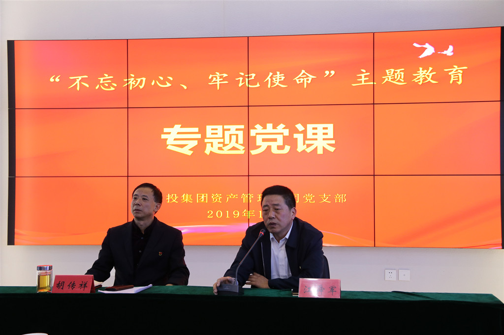 為教育引導黨員干部不忘初心,牢記使命,擔當作為,開拓創新,奮力譜寫金融工作新篇章,1010日下午,資產管理公司黨支部舉行“不忘初心、牢記使命”主題教育黨支部書記講黨課活動,資產管理公司黨支部書記、董事長胡傳祥同志講授“初心不改,擔當作為,創造無愧于時代的工作業績”主題黨課,集團黨委第一指導組同志到會指導。