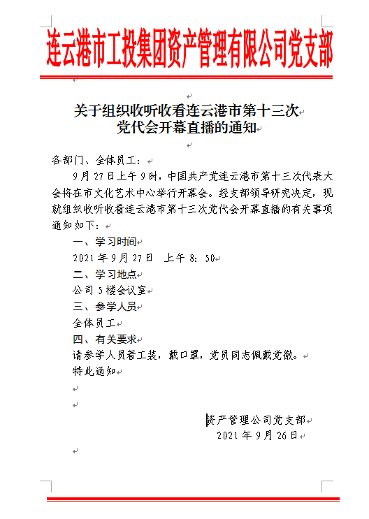 關(guān)于組織收聽收看連云港市第十三次黨代會開幕直播的通知