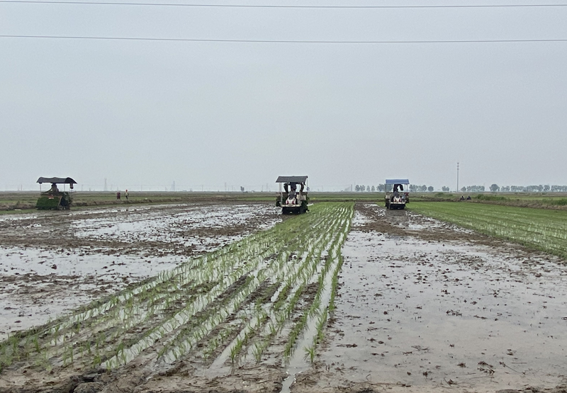 走進大新農場田間地頭,伴隨著機械轟鳴聲,插秧機往來穿梭,一株株嫩綠的秧苗在插秧機苗盤上滑落,整齊地插入水田里。