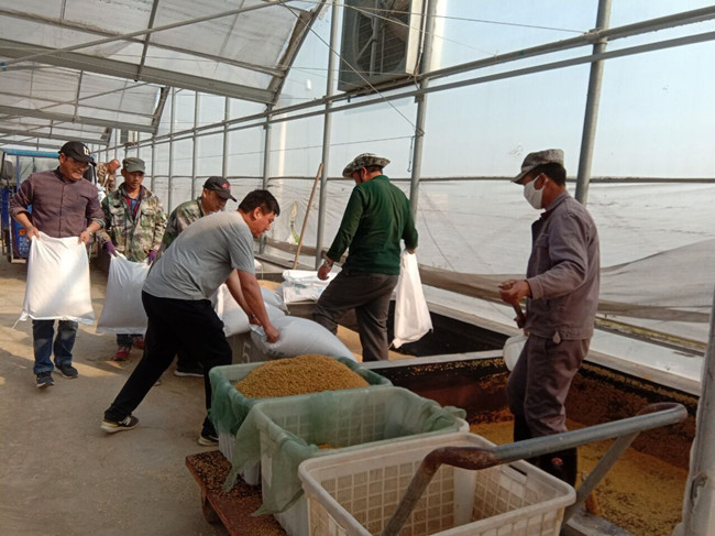 近日,生態種養中心大棚育秧正式開始,全體人員迅速投入工作狀態,運送秧盤,調試育秧播種設備,浸泡稻種等工作有序進行,據統計,今年大棚暗化育秧6萬余盤,55日左右完成,確保嚴格按照“320”計劃保障農時。(嚴鑫)