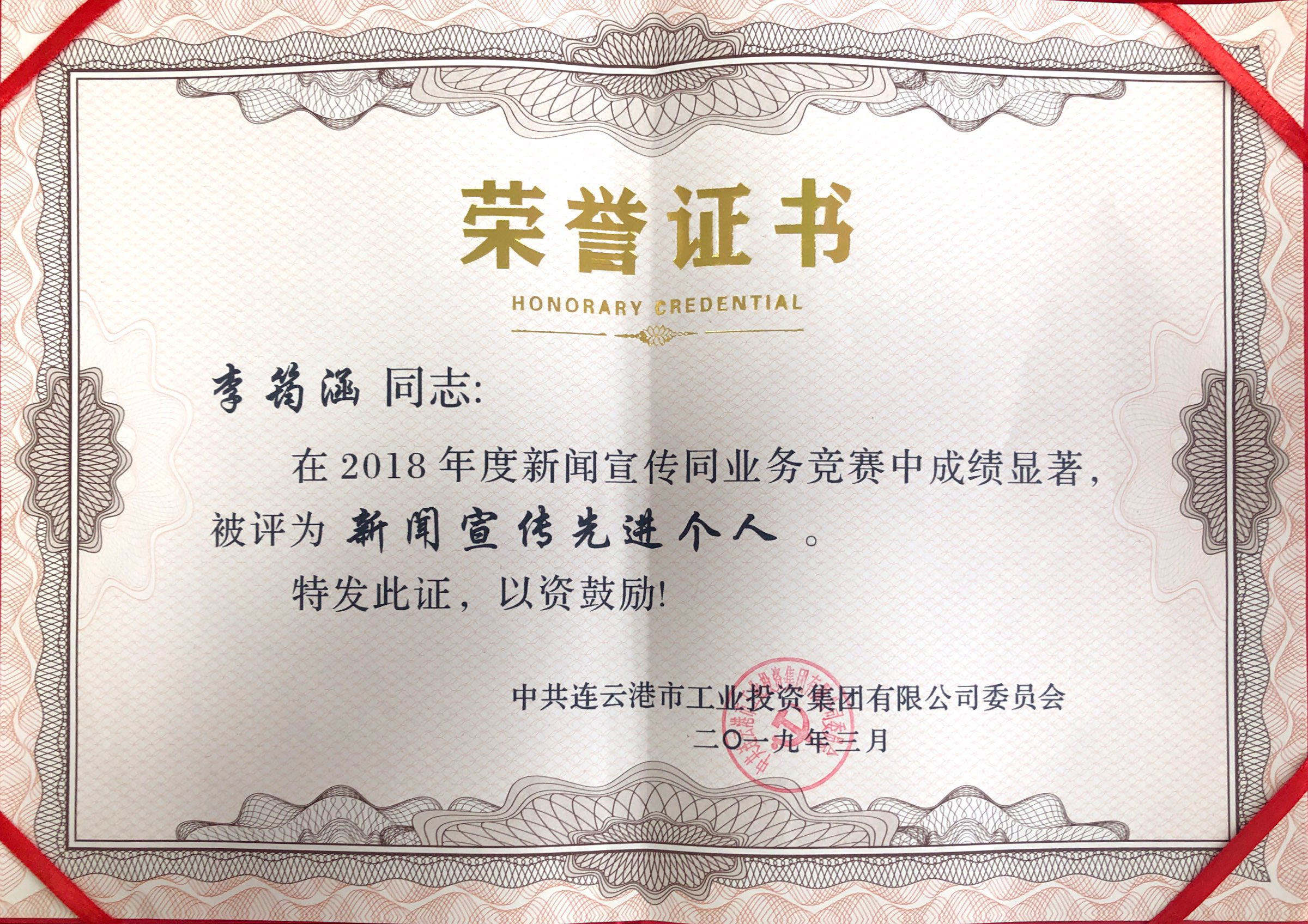 315日下午,集團黨委召開了“聚焦高質高效,聚力創新創優”黨內主題教育實踐活動部署推進會。會上,我公司被評為“2018年度新聞宣傳工作先進單位”;黨支部副書記袁忠所著評論文章《揚帆破浪開啟高質發展新征程》,入選“2018年度《連云港工投》好新聞”;李筠涵獲得“2018年度新聞宣傳工作先進個人”稱號。