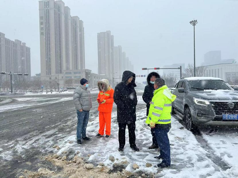 上午10時許,暴雪如約而至。裝有融雪劑的車輛全部整裝待發,聞令而動,采取“人工+機械”不間斷作業模式,對轄區主次干道、橋涵、火車站東站、創智大廈等帶坡路段及時拋撒融雪劑,采取“滾刷+鏟車”組合方式,反復排掃路面積雪,確保主次干道、帶坡路段通暢無冰。