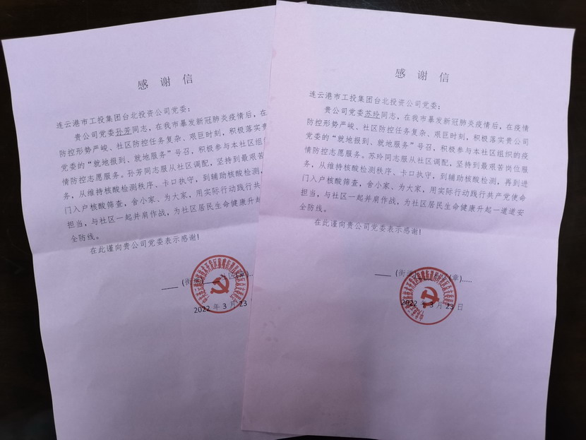 “臺北投資公司的黨員同志們視疫情防控為己任,服從調度安排,站好每一班崗,不僅認真履行防控職責,又創新開展疫情防控教育宣傳、便民服務等多項活動,成為我們社區防疫攻堅的主力軍。”325日,收到開發區猴嘴街道昌圩社區送來的一份特殊的“禮物”— 一封疫情防控感謝信,感謝臺北投資公司黨員蘇玲、孫芳等同志在新冠肺炎疫情防控的關鍵階段挺身而出、伸出援手,參與協助社區的疫情防控工作。