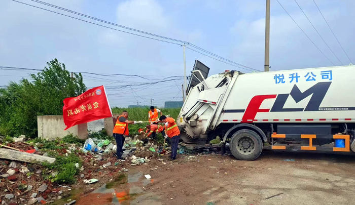 ? ? ? ?8月22日上午,室外熱浪滾滾,橙色工作服在強烈陽光照耀下顯得格外引人注目。環(huán)衛(wèi)分公司黨員突擊隊第一時間加入到環(huán)境衛(wèi)生“治理”中。活動中,隊員們沖鋒在前,不怕臟、不怕累,及時對轄區(qū)各類生活垃圾進行清理。在轉(zhuǎn)運各類垃圾過程中,該分公司管理人員身先士卒,積極與大家奮戰(zhàn)在一起,經(jīng)過4個小時的連續(xù)作戰(zhàn),共清理垃圾點4處,清運垃圾約7余噸。