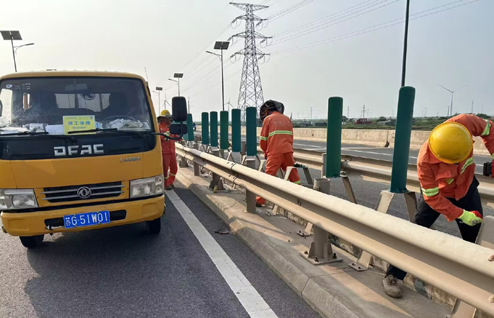 9月11日下午,市政分公司開展橋梁中分帶缺損防眩板專項維修行動,工作人員加班加點,攜手奮戰,完成維修任務,排除安全隱患,保障過往車輛行駛安全。